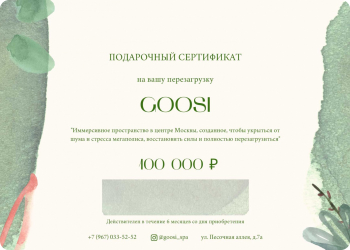 Вы сами выбираете номинал подарочного сертификата, им можно как оплатить услугу целиком, так и воспользоваться чтобы оплатить часть услуги, осуществив доплату на месте.
